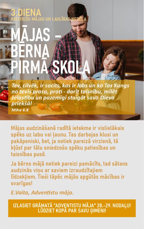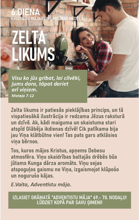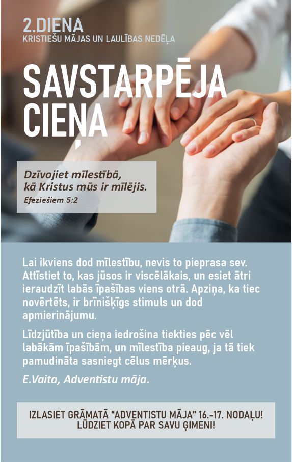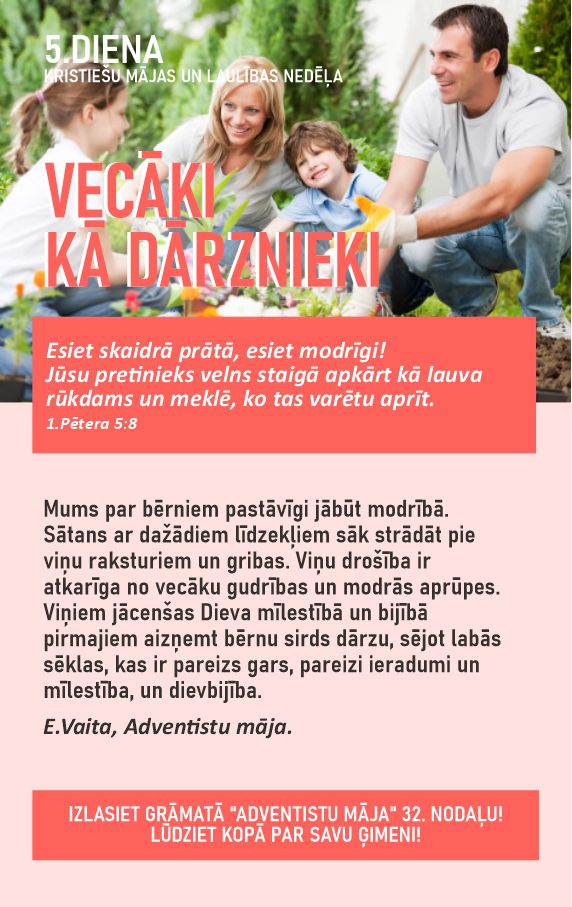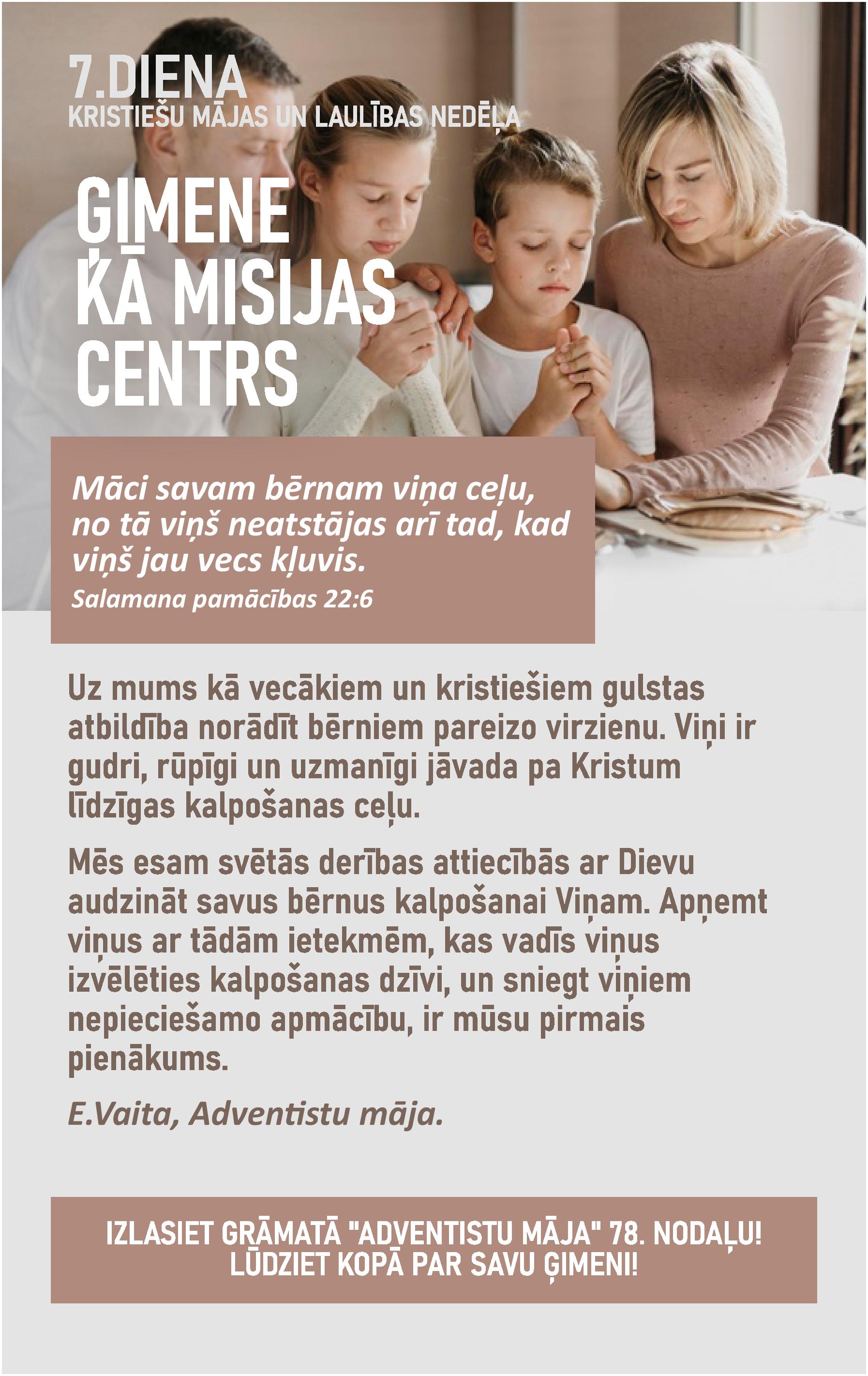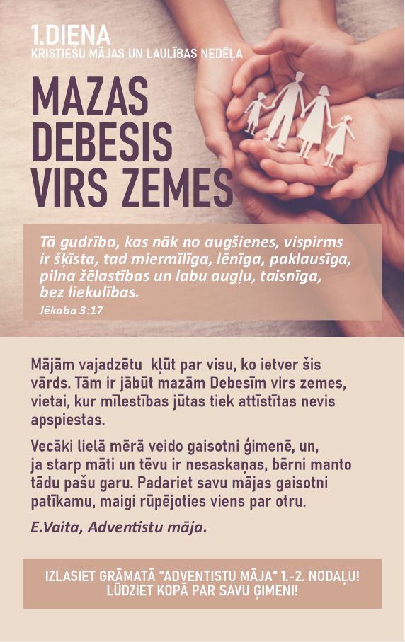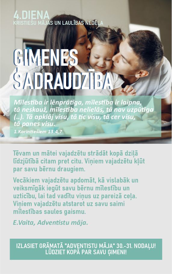 “Ģimenes saites ir visciešākās, vismaigākās un vissvētākās no visām saitēm virs zemes. Tās bija domātas par svētību cilvēcei. Un tās arī ir par svētību, ja vien laulības derība tiek noslēgta saprātīgi un dievbijībā, pareizi izprotot savu atbildību. Ikvienai mājai vajadzētu būt vietai, kur valda mīlestība un mājo Dieva eņģeļi, darot vecāku un bērnu sirdis iejūtīgas un pakļāvīgas. Mūsu mājām ir jākļūst par Bēteli, un mūsu sirdīm – par templi. Kamēr dvēselē tiek lolota Dieva mīlestība, tajā valdīs miers, būs gaisma un prieks. Mīlestībā atveriet un lasiet Dieva Vārdu savas ģimenes lokā un jautājiet: “Ko Dievs ir teicis?” (E. Vaita. “Adventistu māja”)