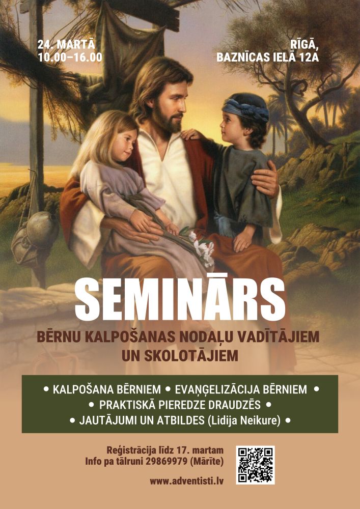 Adventistu draudžu bērnu kalpošanas nodaļu vadītāji un skolotāji ir aicināti piedalīties seminārā, kas notiks 24. martā no 10.00 līdz 16.00 Rīgā, Baznīcas ielā 12a.