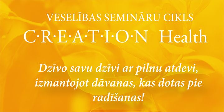 Piedalies veselības semināru ciklā "Creation Health" katru svētdienas pēcpusdienu no 8. līdz 29.oktobrim! “Creation Health” ir veselības atjaunošanas programma, ko 2016.gadā izstrādāja ārsti no ASV slimnīcas "Florida Hospital”. Programmas mērķis ir palīdzēt cilvēkiem sasniegt maksimālu veselību un labsajūtu, kādu Dievs paredzējis katram cilvēkam. Ar interaktīvām lekcijām, darbu grupās un kopīgām diskusijām tiks aplūkoti 8 veselīga dzīvesveida pamatprincipi – izvēle, atpūta, vide, aktivitātes, uzticība, savstarpējās attiecības, dzīves perspektīva, uzturs.