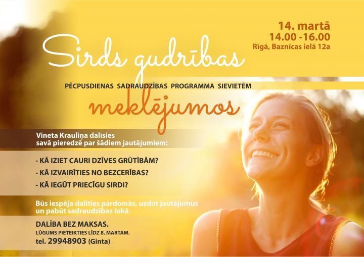 Дневная программа для женщин в рамках программы «В поисках мудрости сердца» пройдет 14 марта с 14.00 до 16.00 в Риге, на улице Базницас, 12а.