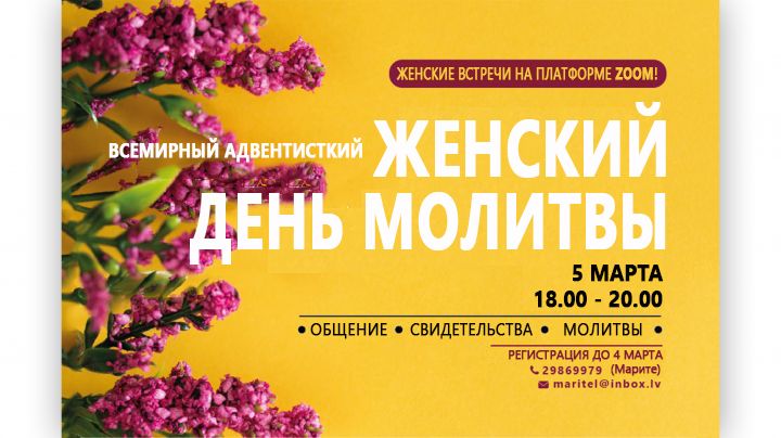 В этот день в 1-ой Рижской церкви состоится богослужение, посвященное Дню женской молитвы, на котором с проповедью выступит руководитель отдела молитвенной службы ЛК Байба Берзиня. Тема проповеди — «Молитва в последние дни».